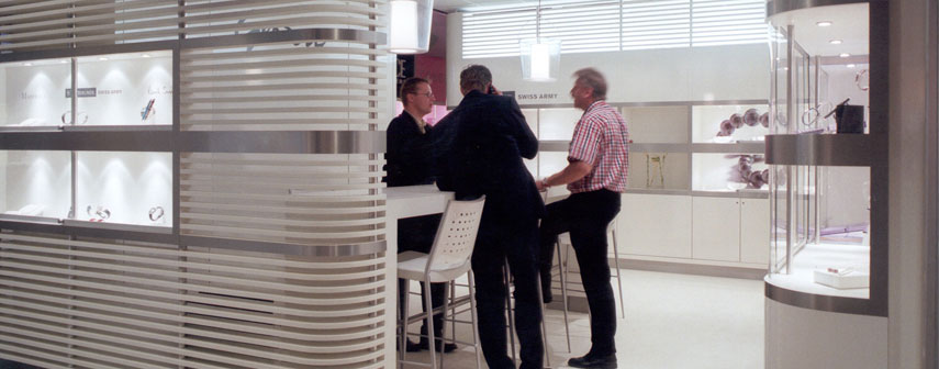 Gerzon Jewelry ShopGerzon voert als importeur van sieraden en horloges verschillende merken zoals Paul Smith, Majorica en Victorinox. Om deze zéér uiteenlopende merken op stijlvolle wijze te etaleren is gekozen voor een geheel witte en neutrale setting met alleen tegen de achterwand van de vitrines logo’s en brand images. Het licht dat door de lamellenstructuur valt geeft een sfeervol en enigszins mystiek lichtaccent.